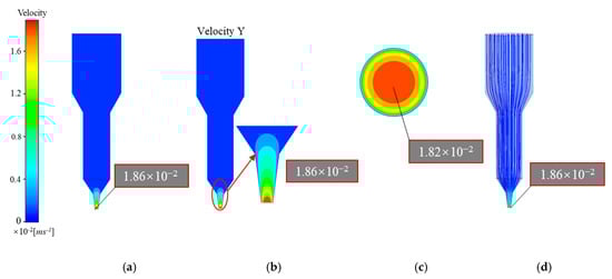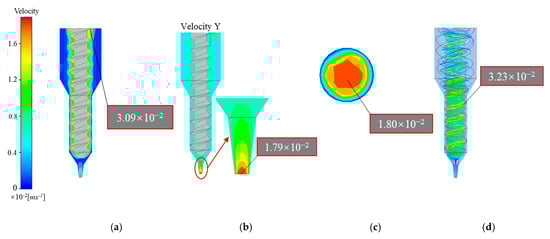 Figure 6a and Figure 7b show that the overall and longitudinal velocity fields in the flow channel of the 3D printer with a plunger structure remain largely consistent. However, as shown in Figure 7a,b, the screw-based flow channel exhibits notable variations between the overall and longitudinal velocity fields. The plunger structure achieves laminar flow from top to bottom, resulting in stable extrusion with minimal radial velocity distribution. In contrast, the screw structure generates rotational flow, a more complex extrusion process where the rotation of the screw drives the slurry downward, introducing a radial velocity component. This results in a more intricate velocity field distribution in the screw structure compared to the plunger structure.