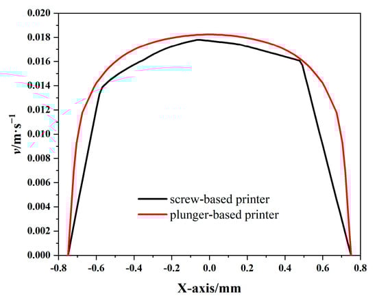 As shown in Figure 6c and Figure 7c, the axial velocity at the outlet cross-section of the plunger extrusion structure exhibits superior uniformity and consistency compared to the screw extrusion structure. By examining the velocity variation curve along the X-axis at the outlet cross-section (Figure 8), it is apparent that the plunger structure exhibits an approximately parabolic velocity distribution. This velocity variation is more continuous than the stepped changes seen in the screw structure, thus better maintaining the uniformity of the extruded slurry’s velocity.