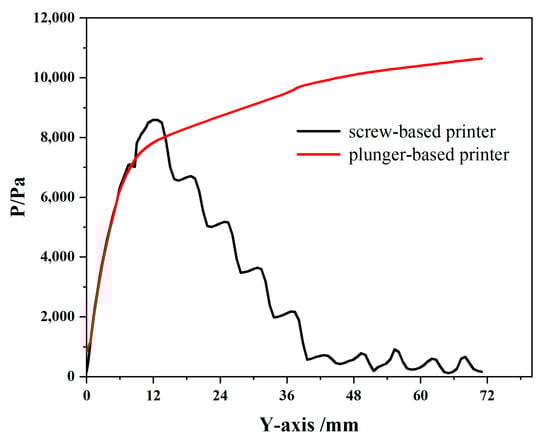 In contrast, as shown in Figure 9b and Figure 10, the pressure distribution within the plunger extrusion flow channel is relatively simple. The slurry pressure gradually decreases along the flow channel, with a rapid drop at the nozzle outlet, forming a pressure gradient that facilitates smooth slurry extrusion between the barrel and nozzle. Since the plunger supplies the extrusion power, some slurry within the barrel must sustain the maximum pressure (10,644.9 Pa) during printing. Higher slurry viscosity requires greater force from the driving mechanism to ensure consistent extrusion.