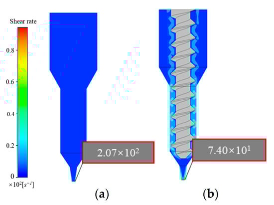 Shear rate distribution contour: (a) plunger extrusion printer; (b) screw extrusion printer.