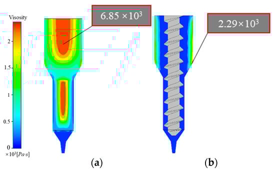 Viscosity distribution contour: (a) plunger extrusion printer; (b) screw extrusion printer.