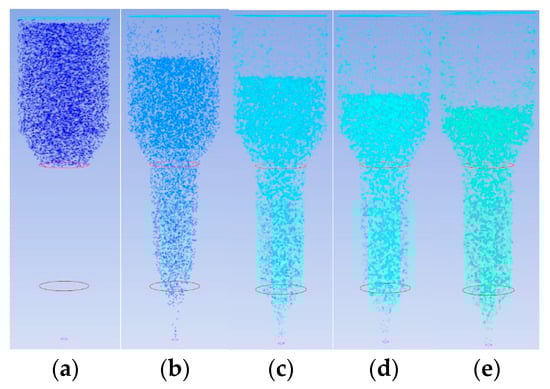 Figure 13a–e display particle distributions across different cross-sectional slices in the plunger extrusion flow channel. As the plunger compresses the slurry, particles gradually move toward the outlet, with particles starting to exit at the eighth slice. Between slices 12 and 20, most particles leave the barrel. Particle velocity increases as the particles travel from the barrel to the outlet, reaching a peak at the outlet. In contrast, Figure 14a–e show that in the screw extrusion mechanism, particles only begin to exit around the 269th slice, indicating that screw extrusion requires more time to reach a steady extrusion state when starting a new print job. Subsequently, the number of extruded particles increases, stabilizing from the 300th slice onwards as the screw rotates. However, by the 900th slice, some particles accumulate and stagnate near the outlet, resulting in a gradual reduction in particle extrusion and increasing the risk of nozzle clogging. Therefore, compared to the plunger-type mechanism, the screw-type extrusion requires a larger nozzle to ensure consistent slurry flow under identical extrusion conditions.