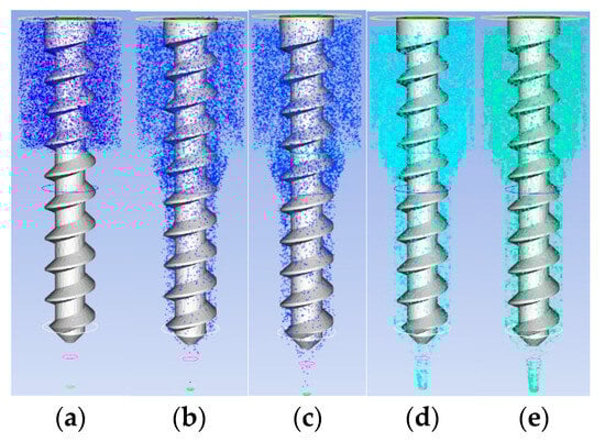 To address particle transport issues in extrusion systems, a comparative analysis of particle transport in different extrusion structures was conducted using the hybrid simulation method in ANSYS/POLYFLOW 2022R1 software. Figure 13a and Figure 14b show the initial particle distributions within the two extrusion structures. In plunger extrusion, the propellant slurry fills the barrel by gravity after loading, so a particle source was established in the barrel section to simulate the initial extrusion state. For screw extrusion, the slurry is supplied continuously through an external feeder, with particle transport primarily driven by the rotation of the screw. Therefore, a particle source for screw extrusion was established within the cylindrical section of the barrel.