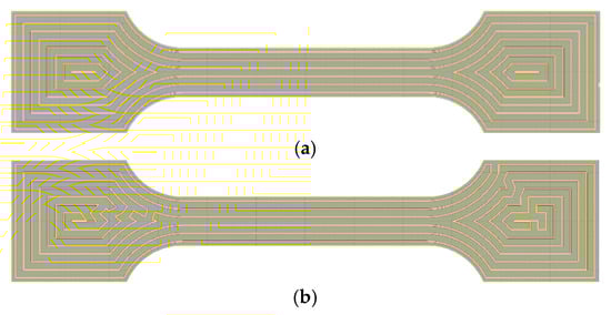 Path planning for dumbbell-shaped specimens: (a) non-connected concentric circle filling method; (b) connected concentric circle filling method.