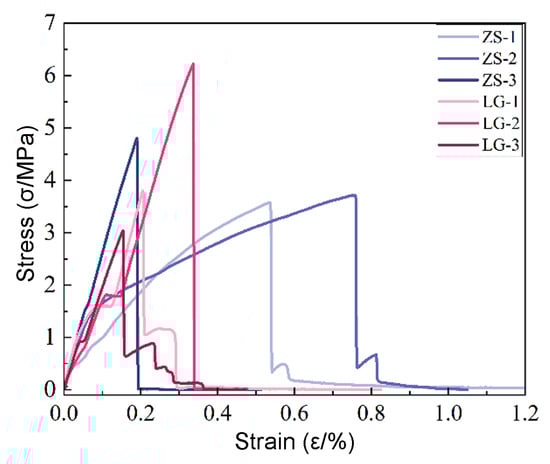Tensile tests were conducted on the printed propellant specimens using a universal tensile testing machine (INSTRON 5969, Instron, Norwood, NY, USA) at 20 °C with a tensile speed of 2 mm/min. The results, shown in Figure 18, depict the stress–strain curves of specimens formed by each method, where ZS13 corresponds to the specimens formed by plunger extrusion and LG13 corresponds to those formed by screw extrusion.