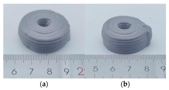 Cura 4.7 offers various fill patterns, including zigzag, concentric circles, and straight lines []. To achieve a fully and tightly filled sample, a concentric circular filling strategy was selected, as shown in Figure 15a. However, with a concentric circle path, the nozzle must rapidly transition to the next circle after completing each pass. This can lead to overfilling at transition points due to the continuous flow of slurry; conversely, underfilling can occur even with retraction settings due to flow lag, resulting in printing defects. To address this, a connected concentric circle filling path was chosen, requiring only one continuous pass per layer. This eliminated the need for the nozzle to switch circles within each layer, thus enhancing the overall print quality.