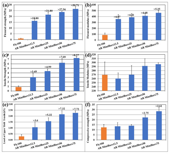 Mechanical properties of AR MiniBars™ FRBCs: (a) flexural strength; (b) flexural modulus; (c) tensile strength; (d) tensile modulus, (e) force load at upper yield tensile strength; (f) compressive strength.