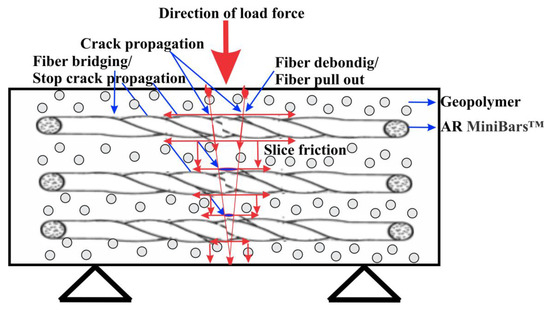 The continuous unidirectional AR MiniBars™ had an orientation parallel with the length of the mold (Figure 7). When a force is applied on AR MiniBars™ FRBCs, perpendicular to the fiber orientation, the AR MiniBars™ at the first level in the geopolymer will break and the other AR MiniBars™ will act as crack stoppers. If the force increases, the AR MiniBars™ will try to resist this force, but, at the same time, some events will appear, such as fiber debonding, slice compression, and fiber pulling out, and the last fiber will break when the crack reaches the next level of the AR MiniBars™. When the indenter presses the sample in the flexural test, the geopolymer and AR MiniBars™ will deform, by sliding the region between the fibers and increasing the pressure from slice to slice (Figure 7). In the structure of the geopolymer (Figure 7), we could see many spherical particles fixed in the 3D matrix of the geopolymer binder. The surface of AR MiniBars™ was created for this type of micromechanical adhesion and is similar to the surface of a deformed steel bar used in construction. Unfortunately, at the surface of AR MiniBars™, a chemical bond, it is not possible, but the helix surface of AR MiniBars™ will be an advantage for micromechanical adhesion. There are two internal changes inside the sample when the load is applied. First, an elastic deformation occurs, which is a reversible deformation, and, at the end, a plastic deformation occurs, which is irreversible and will generate cracks and the failure of the geopolymer and AR MiniBars™ or the pull-out of the AR MiniBars™ from the geopolymer. In the flexural test, the crack propagation in the samples appears in the direction of the applied force.