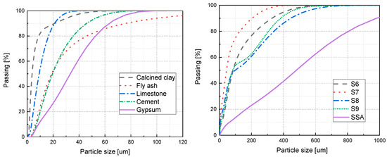 In this investigation, the raw materials utilized included P·O 42.5 cement, SSA (derived from sludge incineration), calcined clay, fly ash, calcium oxide (CaO), limestone, and gypsum. The P·O 42.5 cement adhered to the specifications outlined in the Chinese standard GB 175-2007 [28] and corresponded to the classification CEM II/A-M 42.5N, as stipulated by BS EN197-1:2011 [29]. The composition, both mineralogical and chemical, of the diverse materials underwent analysis through X-Ray fluorescence spectroscopy (XRF), and their physical attributes are presented in Table 1. Specifically, No. S6 denotes sludge incineration ash derived from sludge calcined at 600 °C.