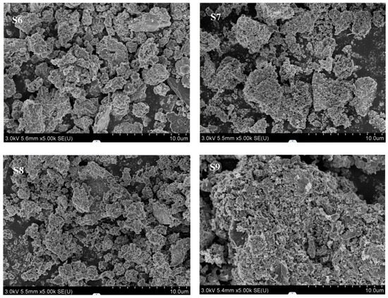 The distributions of particle sizes for all materials, as determined through laser diffraction, are depicted in Figure 2. The results indicate that SSA is considerably coarser compared to clay and fly ash (FA). Furthermore, sludge ash that has undergone incineration is finer than its pre-incineration state. Figure 3 displays the SEM (scanning electron microscope) images of sludge ash with varying calcination temperatures. It is evident from the figure that the particle sizes of S8 sludge ash are larger than those of S6, S7, and S9. The sludge ash particles exhibit irregular shapes and rough surfaces. During calcination, the breakdown of organic matter in sludge ash particles gives rise to additional residual pores, augmenting the sludge ash’s specific surface area and water uptake capacity. With increasing calcination temperature, specific components of the sludge incineration ash undergo sintering or melting processes, which modify the pore structure within the particles, potentially causing a reduction in porosity due to pore closure or alteration. Consequently, the density and particle size of the sludge incineration ash increase, while the specific surface area and water absorption rate show a decreasing trend.