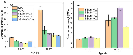 Development of the compressive strength of SSA30-600, SSA30-700, SSA30-800, SSA30-900 (a), OPC, LC3, SSA10-FA20, SSA20-FA10, SSA20-CaO10 (b) up to 3d and 28d.