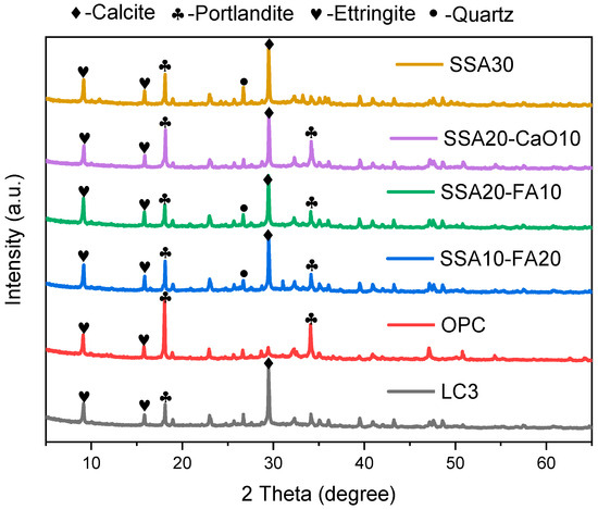 - The incorporation of SSA into LC3 did not produce notable alterations in the phase compositions of the modified pastes compared to normal LC3. The primary crystalline minerals observed in the modified LC3 pastes include calcite (CaCO3), portlandite (Ca(OH)2), ettringite (AFt), and quartz (SiO2). Notably, compared to the pure OPC group, the Ca(OH)2 content was lower, while the calcite content was higher in LC3 pastes with SSA.