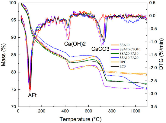 By conducting TG/DTG analyses on cement paste samples aged for 28 days, varying in SSA, fly ash (FA), and calcium oxide concentrations, a deeper understanding of SSA’s influence on the composition of calcite (CaCO3), portlandite (Ca(OH)2), ettringite (AFt), and quartz (silica) within the cement paste can be gained. Figure 6 shows the analysis results. According to the TG curves, when the temperature rose, the mass of the cement paste samples underwent a reduction. Distinct weight losses were noted at temperatures approximately 100 °C, 400 °C, and 700 °C, attributed to the decomposition of ettringite, portlandite, and calcite, respectively. The incorporation of admixtures exhibits a diluting effect, enhancing the degree of hydration of cement; consequently, polyblended cement paste demonstrates a higher hydration degree compared to pure cement paste [53,54]. With the different SSA additives, the Ca(OH)2 (portlandite) content becomes lower than that in pure cementitious materials. The diagram below illustrates the variation in the CaCO3 (calcite) contents within cement matrices that incorporate distinct SSA additives is higher than that in the ordinary cementitious materials, which is related to the addition of limestone.