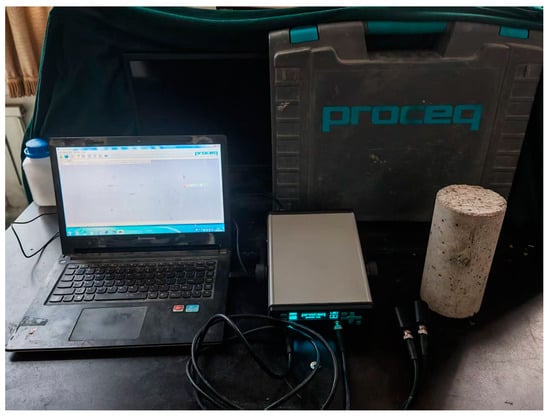 Ultrasonic waves propagate at different speeds through different matrices, allowing them to be used to detect damage within concrete. In this study, the Pundit Lab ultrasonic detector from Switzerland and located in Dalian, China, shown in Figure 3, is used to measure ultrasonic wave velocity, according to ASTM C597 [38]. The transmit and receive frequencies are set to 54 kHz, with a data acquisition period of 0.4 μs. The ultrasonic wave velocity inside the concrete cylinder specimens is measured both before and after the uniaxial compression test. The relationship between the ultrasonic wave velocity and the damage variables of each group of specimens under different stress levels is then analyzed.