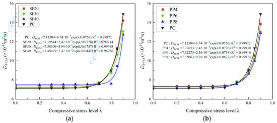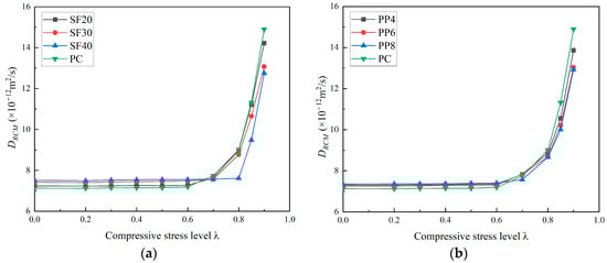 Relationship between chloride diffusion coefficient and uniaxial compressive stress level of FRC. (a) SFRC; (b) PFRC.