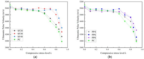 Relationship between ultrasonic pulse velocity and stress level of concrete subjected to uniaxial compressive load. (a) SFRC; (b) PFRC.