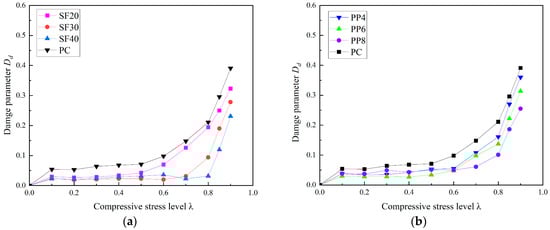Relationship between damage parameter and stress level of concrete subjected to uniaxial compressive load. (a) SFRC; (b) PFRC.