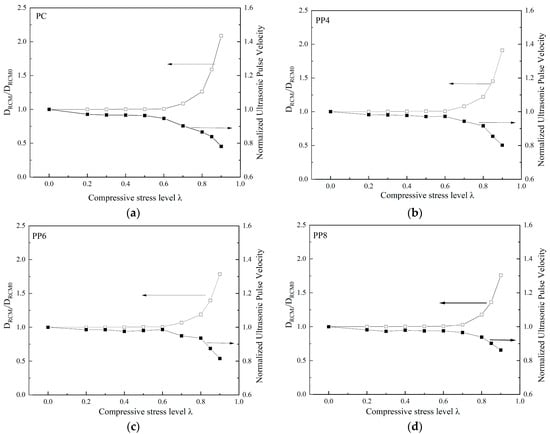 Effect of uniaxial compressive load level on the ultrasonic pulse velocity and chloride diffusion coefficient of specimens: (a) PC; (b) PP4; (c) PP6; (d) PP8.