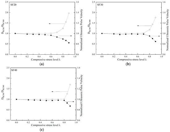 Effect of uniaxial compressive load level on the ultrasonic pulse velocity and chloride diffusion coefficient of specimens: (a) SF20; (b) SF30; (c) SF40.
