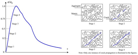 Constitutive Behavior of Concrete under Uniaxial Compression (left blue curve) and Schematic Illustration of Crack Propagation under Uniaxial Compressive Loading.