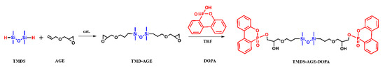 In a 250 mL three-neck flask equipped with a magnetic stir bar, thermometer and reflux condenser, 15.618 g (43 mmol) of 1,3-bis(3-glycidyloxypropyl)tetramethyldisiloxane (TMDS–AGE), 20 g (86 mmol) of 10-hydroxy-9,10-dihydro-9-oxa-10-phosphaphenanthrene-10-oxide (DOPA), and 150 mL of THF were placed. The solution was stirred and heated to 60 °C. Over time, the DOPA precipitate begins to disappear, and a fully clear solution is obtained—which clearly indicates that DOPA is converted to the product because the DOPA precipitate does not dissolve in THF even after many hours of stirring at elevated temperature. Additionally, the progress of the reaction was analyzed by the FT-IR technique by observing the appearance of a band attributed to the hydroxyl bonds (around 3300 cm−1) until a constant value was obtained that did not change over time. The solution was kept at the set temperature and stirred for approximately 48 h (although after 24 h, only symbolic changes in the structure of the FTIR spectrum were observed). Then, to remove the reaction solvent (THF), the solution was poured into a single-necked flask, which was placed on a rotary evaporator. Evaporation gave a pure product as a light yellow, viscous oil with nearly quantitative efficiency (yield 99%, 35.265 g). The chemical structure of TMDS–AGE–DOPA is presented in Figure 1. The obtaining of the compound with the desired chemical structure was determined by FT-IR and NMR spectroscopy: