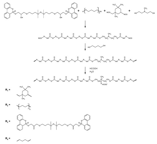 Isophorone diisocyanate 98% (IPDI, Acros Organics, Geel, Belgum), N-methyldiethanolamine (NMDA, Acros Organics, Geel, Belgum), 1,4-butanediol (BD, Sigma-Aldrich, Darmstadt, Germany), formic acid 99% (HCOOH, Chempur, Piekary Śląskie, Poland), and dibutyltin dilaurate (DBTDL, Sigma-Aldrich) were used without further purification. Poly(oxytetramethylene)diol (PTMO, Mn = 1000) was purchased from Merck and dried in a vacuum oven at 105 °C for 2 h before use. 1,1,3,3-tetramethyldisiloxane (TMDS), Karstedt catalyst (2% in xylene), and allyl-glycidyl ether (AGE) were purchased from Aldrich (Darmstadt, Germany). DOPO (9,10-dihydro-9-oxa-10-phosphaphenanthrene-10-oxide) was purchased from TCI Chemicals (Tokyo, Japan), while H2O2 (30% in H2O), THF, and acetone were purchased from Chempur. All reagents were used without further purification. DOPA (10-hydroxy-9,10-dihydro-9-oxa-10-phosphaphenanthrene-10-oxide) was synthesized according to the procedure described elsewhere [20].