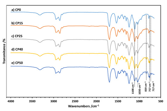 FTIR spectra of CP0 (a), CP15 (b), CP25 (c), CP40 (d), and CP50 (e).