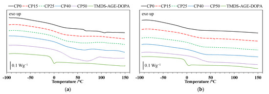 Differential scanning calorimetry (DSC) measurements were conducted using a DSC1 calorimeter (Mettler-Toledo, Greifensee, Switzerland). Approximately 20 mg of each sample was heated in sealed aluminum crucibles over a temperature range of −100 to 150 °C at a heating rate of 10 °C/min under a nitrogen flow of 50 mL/min. The glass transition temperature (Tg) was determined as the inflection point on the curves obtained during the second heating cycle.
