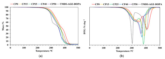 The TG and DTG curves recorded at a heating rate of 10 °C min−1 in nitrogen are presented in Figure 5a,b, and Table 2 provides their interpretation. Thermal degradation of TMDS–AGE–DOPA occurs in two main stages in the temperature range of 180–320 °C and 320–520 °C, respectively. The temperature of the maximum mass loss rate at the first stage (Tmax1) is lower compared to all the modified samples. The char yield is very low and does not exceed 3%. Thermal degradation of the unmodified sample is typical for polyurethanes and occurs in two main stages in the temperature range of 200–380 °C and 380–460 °C. The first step of decomposition is associated with the degradation of hard segments derived from IPDI, NMDA, and BD. The temperature of the maximum mass loss rate at this stage (Tmax1) is 351 °C and is accompanied by a mass loss (Δm1) of 54.7%. However, at the beginning of that stage up to 330 °C, a plateau is visible, indicating the presence of an additional stage. The second stage is related to the degradation of flexible segments originating from PTMO. The mass loss in this stage (Δm2) is 44.8%, and Tmax2 = 409 °C. The thermal degradation of the modified samples follows a slightly different pattern with the addition of modifier, as can be seen from the DTG curves. Only for CP15 and CP25 samples can two separate stages, accompanied by sharp peaks in the DTG curve, be detected. As the modifier content in the sample increases, the stages begin to overlap, and one main thermal degradation stage appears (CP40 and CP50). However, two plateau regions also appear at the initial and final stages of decomposition, suggesting a three-stage thermal degradation process. The introduction of TMDS–AGE–DOPA causes an acceleration of the thermal degradation of cationomers, as confirmed by the reduction of Tmax1 from 351 to 323 °C and Tmax2 from 409 to 382 °C for samples CP0 and CP25, respectively. For the remaining samples, only one temperature can be identified for the main degradation step on the DTG curve, which is even lower and is 370 and 365 °C for samples CP40 and CP50, respectively. Similarly, the temperature of 5% mass loss (T5%) is reduced from 283 °C for the unmodified sample to 261 °C for the sample containing 19% modifier. This is because the thermal resistance of the P–C and O=P–O bonds is lower than that of the C–C bond; therefore, the modifier degrades at a relatively lower temperature. In general, the generated phosphoric and polyphosphoric acid could accelerate the dehydration of polyurethanes, thus promoting their charring behavior [10]. However, above a temperature of 400 °C, subsequent reactions related to the degradation of condensed aromatic structures should be expected. The mass residue at 500 °C for the modified samples was in the range of 0.6–1.1%, which may indicate the formation of a charred layer that prevents the fire from spreading, made up of silane moieties. The relatively small amount of degradation residues may be due to a low percentage of phosphorus and silane in the samples. It may also indicate a catalytic effect of the modifier, accelerating the decomposition of the sample toward the production of volatile gases rather than char.