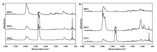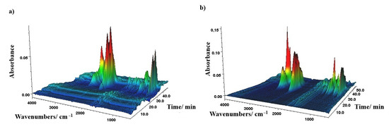 The 3D FTIR spectra for representative CP0 and CP50 samples are presented in Figure 6a,b. Figure 7a,b shows the FTIR spectra of the released gases for several characteristic thermal decomposition temperatures.