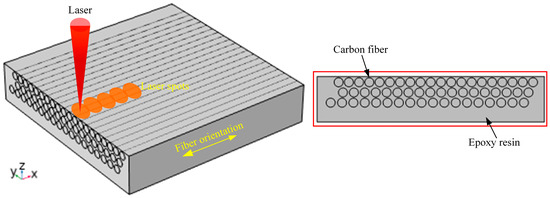 In addition, the boundary condition of the laser processing region is the convective heat transfer between the laser heat source and the surrounding medium. The additional note needs to be added as follows: (1) The material property approximation, in which the thermophysical properties such as thermal conductivity, specific heat capacity, and heat diffusion coefficient of the resin as well as the fibers in CFRP are considered as constants in the model (as shown in Table 1). (2) The geometric structure approximation. In this paper, the fiber distribution in CFRP and the macroscopic geometric structure of the material are simplified, for example, the random distribution of the fibers, the weaving method, and the inhomogeneity of the resin are ignored. (3) The laser energy distribution approximation. When the laser acts on CFRP, its energy distribution in space is not absolutely uniform. In the modeling process, this paper assumes that the laser energy is Gaussian-distributed and given specific parameters such as spot size and power.