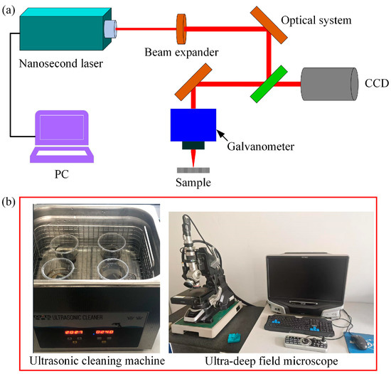 Schematic of nanosecond laser experimental system (a) and characterization method (b).