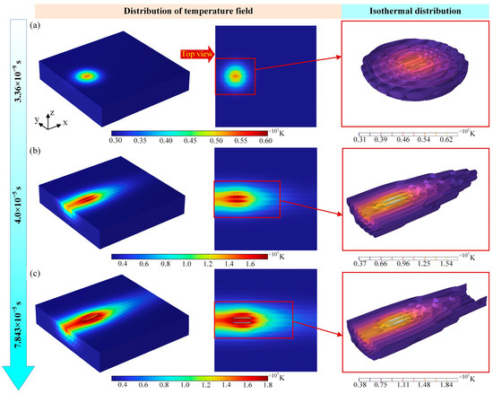 Evolution of transient temperature field with time during nanosecond pulsed laser ablation process: (a) t = 3.36 × 10−9 s, (b) t = 4.0 × 10−5 s, and (c) t = 7.843 × 10−5 s.