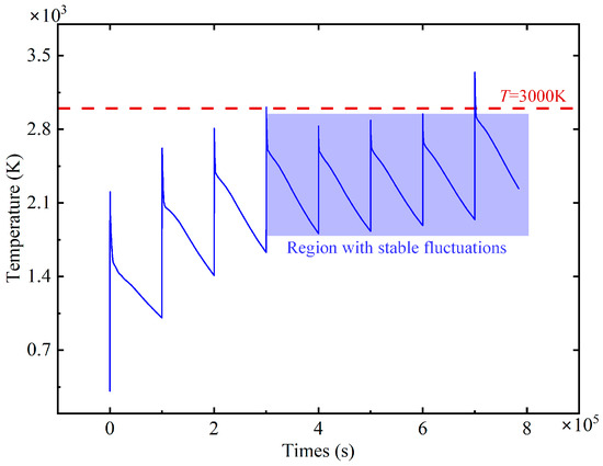 According to the temperature field simulation results in Figure 5, the temperature profile shows relatively stable fluctuations near T = 3000 K. The temperature fluctuations in this region are small, and this region is defined as the stable fluctuation region. This region indicates that at a certain stage of laser ablation, the temperature is kept at a relatively constant level, but there are still small fluctuations. In addition, when the laser action time is within 3 × 10−5 s, the temperature profile shows larger fluctuations. The magnitude of temperature fluctuations in this region is significantly larger than that in the stable fluctuation region, which can be defined as the drastic fluctuation region. This region shows that in another stage of laser ablation, the temperature undergoes significant changes, the laser heating rate is relatively large, and the temperature is not higher than 2800 K. At the same time, the laser heat accumulated on the surface of the material is unstable, and the depth of ablation is about 10 μm.