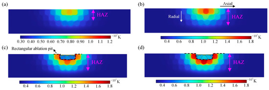 Comparison of the variation in the HAZ in the cross-section of the material under different laser powers is shown in Figure 7. When the laser power is 200 W, the temperature in the center of the spot is relatively large, and the HAZ in the cross-section shows a semi-elliptic shape as a whole, which means that the temperature field directly affects the formation of the HAZ in the study of laser processing of CFRP. In addition, according to Figure 7b, the laser power is increased to 400 W, the temperature in the center region of the spot further increases, and the heat-affected zone further increases, but the energy transferred along the fiber radial direction is lower than that in the fiber axial direction, so that there is little change in the heat-affected zone and ablation pattern along the fiber radial direction. Further, the laser power is increased to 600 W. The epoxy matrix around the fibers is removed by ablation, and some of the fibers are also removed by ablation; finally, a rectangular ablation pit is formed, and the depth of the removed pit is about 4 μm (e.g., Figure 7c). In addition, due to the inconsistency of the thermal conductivity between the axial and radial directions of the fibers, the laser heat transfer rate in the axial direction of the fibers is relatively large, as shown in Figure 7d. The overall performance of the HAZ after laser irradiation is elliptical, and the energy of laser heat transfer to the lower surface of the material tends to increase. At the same time, the heat convection on the lower surface of the material is also lower than that on the upper surface, resulting in a larger range of heat-affected zones in the cross-section of the material.