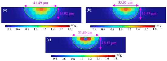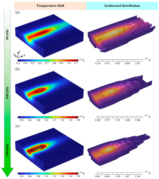 Temperature field clouds at different laser pulse frequencies: (a) 50 kHz, (b) 100 kHz, and (c) 150 kHz.