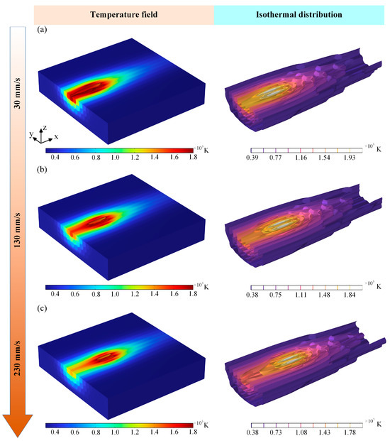 Temperature field clouds at different laser scanning speeds: (a) 30 mm/s, (b) 130 mm/s, and (c) 230 mm/s.