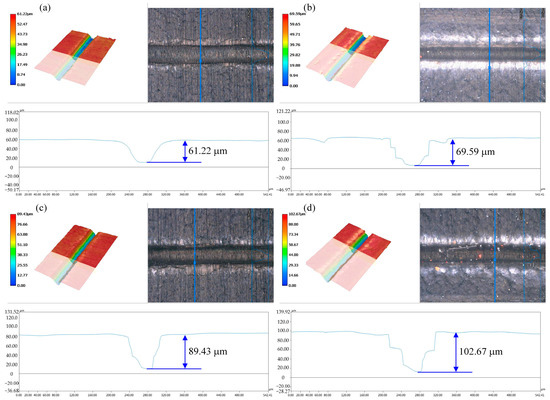 Contour variation in grooves at different laser powers: (a) 200 W, (b) 400 W, (c) 600 W, (d) 800 W.