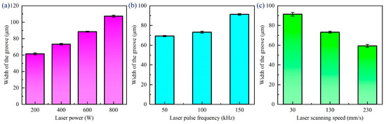 Variation patterns of width of grooves at different laser parameters: (a) laser power, (b) laser pulse frequency, (c) laser scanning speed.