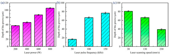 Variation patterns of depth of grooves at different laser parameters: (a) laser power, (b) laser pulse frequency, (c) laser scanning speed.