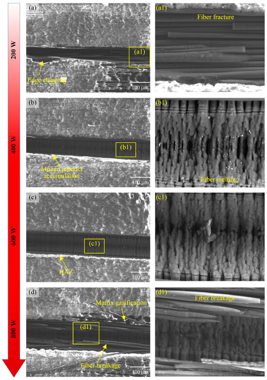The surface micromorphology of laser-ablated CFRP grooves shows significant features with the variation in the laser power, as shown in Figure 15. When the laser power was increased from 200 W to 400 W, the width of the grooves gradually increased and the edges were relatively neat, which was attributed to the increased material removal efficiency due to the enhanced laser energy. Upon further increase to 600 W, the groove width continues to expand, but ablation becomes apparent and slight melt product build-up and chipping begins to occur at the edges, due to more severe pyrolysis and cavitation of the material surface as a result of the widening of the heat-affected zone caused by the high laser energy. When the laser power reaches 800 W, the groove width increases significantly, but the ablation phenomenon is extremely serious, and a large amount of melt product build-up and obvious chipping appear at the edges, which is due to the rapid heating of the material caused by the excessively high laser energy and the generation of violent chemical reactions and mechanical exfoliation.