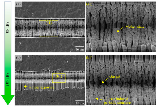 The effect of laser pulse frequency on the surface morphology of the grooves: (a) 50 kHz, (b) 150 kHz, and (a1,b1) are enlarged views of local areas.