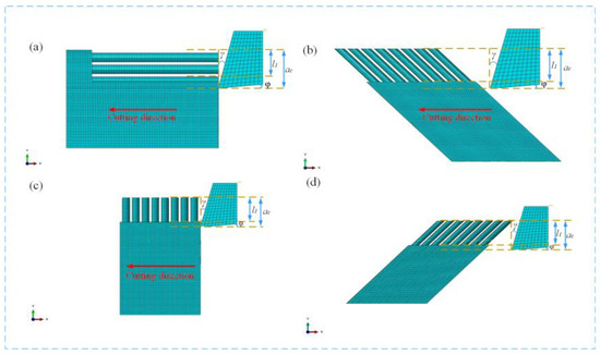 Laser composite cutting model: (a) 0°cutting angle, (b) 45°cutting angle, (c) 90°cutting angle, and (d) 135°cutting angle.