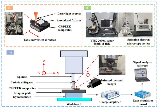High-performance carbon-fiber-reinforced thermoplastic composites (CFRTPs), composed of an organic polymer matrix and carbon fiber reinforcement, offer advantages such as an excellent toughness, thermoformability, recyclability, weldability, and convenient storage over traditional carbon-fiber-reinforced composites [1,2]. These properties enable widespread applications in the aerospace, precision instrumentation, and defense industries [3]. CF/PEEK, a high-performance CFRTP, contains a thermoplastic PEEK matrix with a glass transition temperature (Tg) of 143 °C. It has an excellent biocompatibility and an excellent resistance to chemicals, heat, and abrasion. In addition, thermoplastic materials have a higher tendency to absorb water than thermoset plastics, which makes water-based cutting methods, such as water jet cutting, less desirable for processing CFRTPs [4]. However, due to the anisotropic and heterogeneous structure of CFRTPs, similar to that of CFRPs, the cutting tool alternately interacts with fibers and the matrix during machining. This alternation generates a complex material removal mechanism, with a significant effect on the quality of machined composite components [5]. Similar to other CFRTPs, CF/PEEK composites are commonly fabricated by welding or secondary machining, including turning, milling, drilling, and grinding [6]. Since CFRTP materials have a low thermal conductivity and tend to soften when processed at high temperatures, methods such as dry processing and laser-assisted processing (LAC) are commonly used [7]. Conventional milling (CM) processes often cause surface defects, including delamination, fiber pull-out, burr formation, microcracks, surface depressions, and micro-cavities [8,9].