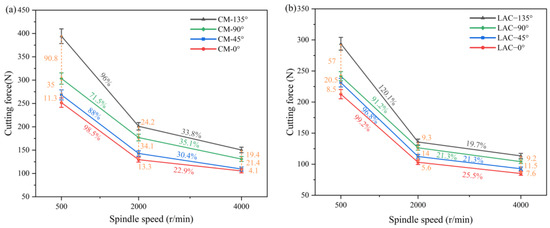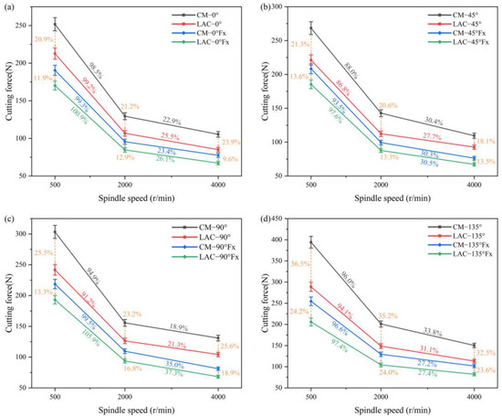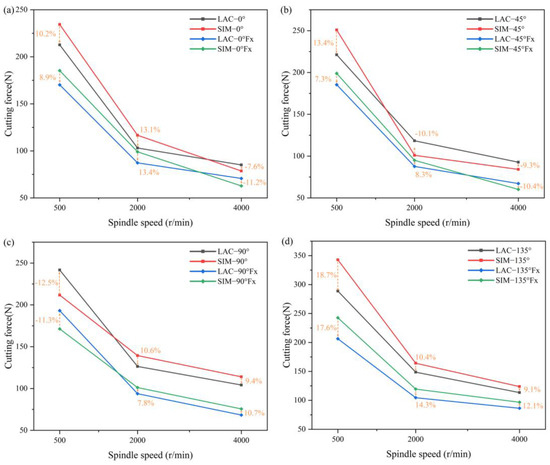 The laser-assisted milling model data were compared with the experimental results. The milling parameters are defined as follows: CM/LAC for conventional milling/laser-assisted milling, 0/45/90/135 for cutting angles of 0°, 45°, 90°, and 135°, and 500/2000/4000 for spindle speed (r/min) (see Appendix A.1 for details).