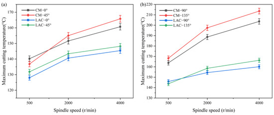 Cutting temperature data under different machining processes: (a) 0° vs. 45°; (b) 90° vs. 135°.
