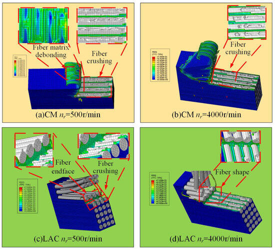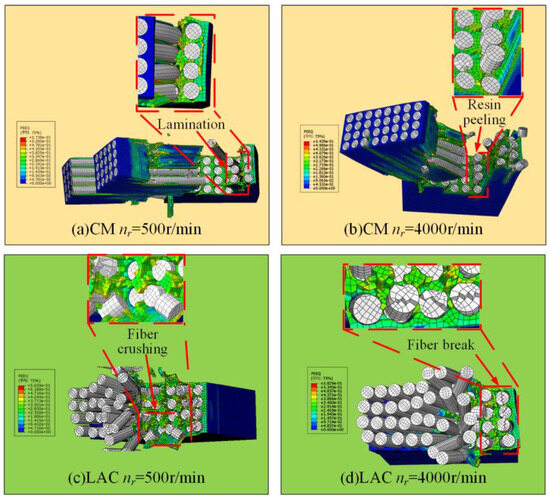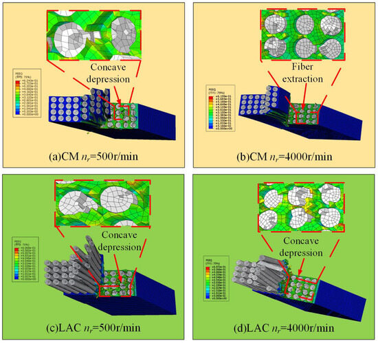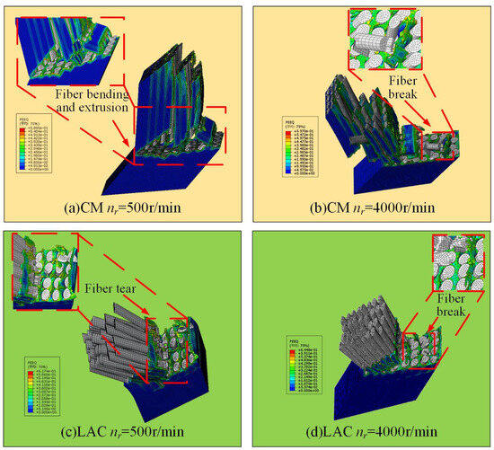 Figure 11 shows the surface damage patterns from simulations at a 90° cutting angle. Under conventional machining conditions, fibers were significantly crushed and broken, with more severe bending. Laser-assisted cutting produced a flatter fiber fracture surface, showing a short fiber morphology and partial fiber pull-out, as confirmed by the experimental results (Figure 12). In Figure 12, at a spindle speed of 500 r/min, the machined surface showed delamination, with significant broken fibers and resin residues. The fiber arrangement was relatively tight, and the fracture exhibited extrusion crushing, indicating more severe extrusion and crushing of the fibers. During laser composite milling, the machined surface was flatter than that of conventional machining, with no cracks. However, slight fiber pull-outs and resin shedding were observed. At a spindle speed of 500 r/min, residual fibers exhibited a short strip structure. As the spindle speed increased, the fiber arrangement loosened and the fractures flattened. A simulation analysis of the fracture mode of fibers after laser composite milling is shown in Figure 12 at a 90° cutting angle. First, the fiber underwent compressive stress at the cutter tip, leading to fracture. At the fiber fracture point, the upper fiber underwent both upward and downward tension, while the front was subjected to forward extrusion and lateral friction from the tool face. As a result, the fibers in this region were gradually crushed, exhibiting localized breakage, typical of compression fracture failure. The lower fiber underwent compressive stress from the cutter tip perpendicular to the fiber axis, causing bending and crack extension and leading to under-face damage as a bending fracture.