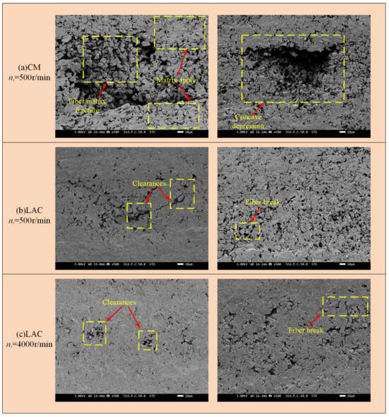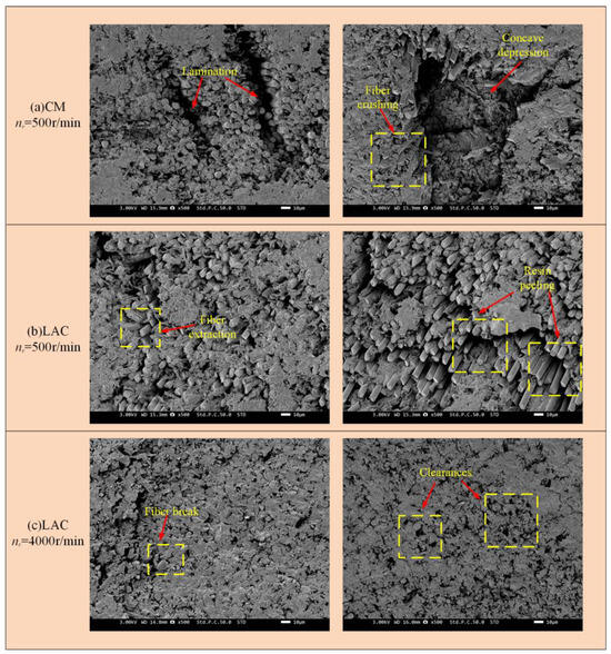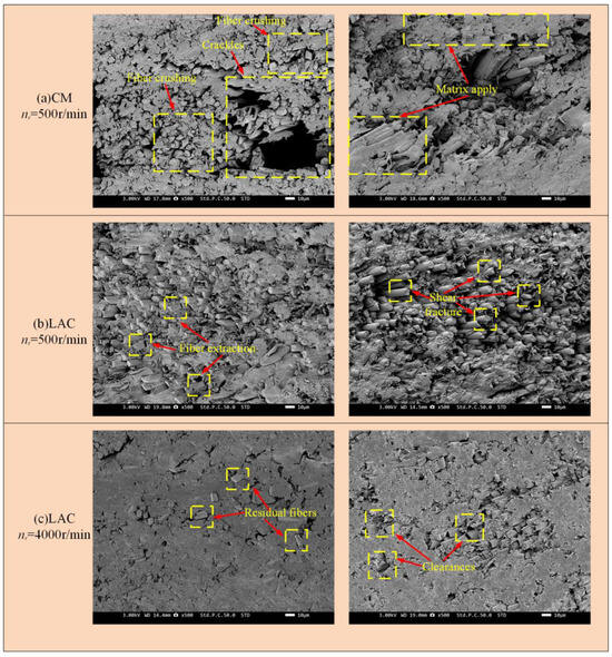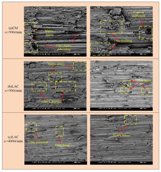 Figure 13 presents the surface damage morphology from the simulation at a 135° cutting angle. Under conventional conditions, the machined surface mainly exhibited an extruded and broken morphology, with numerous cracks formed due to fiber bending and matrix shift. In laser-assisted milling, the fiber fractures in the first half exhibited a tearing pattern, while those in the second half were flatter. Figure 14 presents the SEM image at a 135° cutting angle. Under conventional cutting conditions, the surface cracks were more severe, with the fiber fractures exhibiting an extruded and crushed morphology, and the fibers were tightly packed. At a spindle speed of 500 r/min, surface cracking was particularly severe, with obvious matrix smearing and more prominent fiber breakage. However, as the spindle speed increased, the surface damage decreased. In laser composite milling, no significant cracking occurred, with only minimal fiber pull-out. The fiber fracture exhibited a shear pattern, with residual fibers forming short strips. Moreover, no significant differences were observed between the machined surfaces at varying spindle speeds. At the 135° cutting angle, fiber fractures exhibited a bending-dominant mode [44], requiring more energy and cutting force and resulting in greater surface damage. At a cutting angle of 135, the fibers underwent compression fracture and in-surface shear damage. When the tool contacts the fibers, the force exerted by the tip resembles three-point bending, causing fibers on both sides to converge towards the tip. Fiber bending is more pronounced at the upper tool tip due to shorter fibers and the lack of binding in the lower fibers. As the upper fibers bend, noticeable compression–shear fracture occurs at the tool tip. The upper fibers are sheared by extrusion from the tool face, causing in-plane shear between the fibers and substrate and leading to fiber extrusion along the tool. As the cutting depth increases, the bending of the lower fibers leads to a higher compressive stress at the tool tip and shear stress at the rear tool face, causing crack expansion, debonding between the fibers and the substrate, and the formation of a void on the material surface.