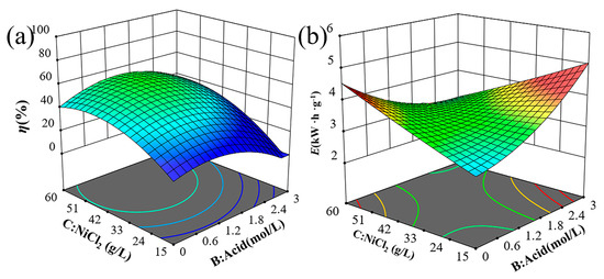 The 3D surface analysis is crucial for evaluating the parameters that influence the response. It helps to understand the interactions between NiCl2 concentration, current density, H2SO4 concentration, and electrolysis time on the response surface. Figure 2 illustrates the 3D surfaces of η and E for various combinations of NiCl2 and H2SO4 concentrations at a fixed current density and electrolysis time. Figure 2a indicates that η initially increases and then decreases with rising NiCl2 concentrations. High NiCl2 concentrations in the electrolyte increase ionic concentrations, enhancing ion interactions and increasing internal stress. This increased stress can impede ion migration and reactions, slowing the electrolytic process and reducing solubility. Figure 2b shows that E slightly decreases as NiCl2 concentration increases from 40 g/L to 50 g/L, but then rises rapidly as the concentration goes from 50 g/L to 60 g/L.