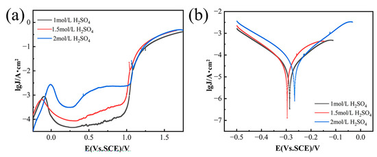 Anodic polarization curves of GH4738 scrap under different H2SO4 concentration. (a) Potentiodynamic polarization curves and (b) Tafel curves.